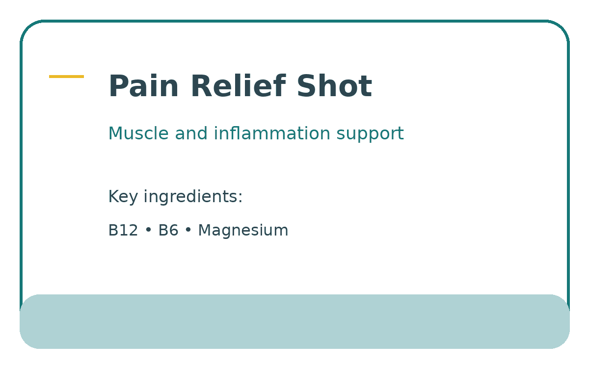 The Pain Relief Shot is a restorative blend that relaxes muscles, soothes nerves, and decreases inflammation. It provides natural support for chronic pain, muscle tightness, and nerve irritation.